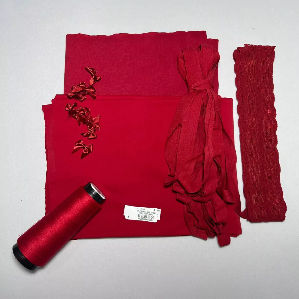 Materiais do kit: Microfibra, Malha, Renda de aproximado 5cm, viés de elástico, lacinho, etiqueta de composição e linha reta.