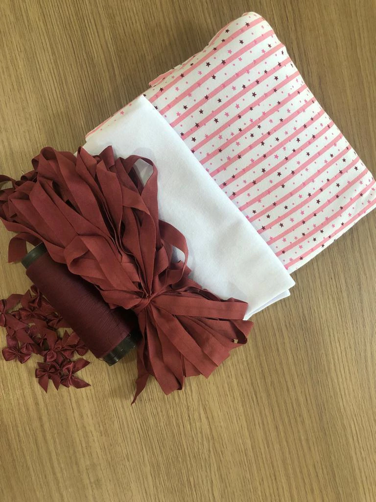 Materiais do kit: Cotton, Malha 100% algodão, Viés de elástico, Laço, Etiqueta de composição e Linha reta.